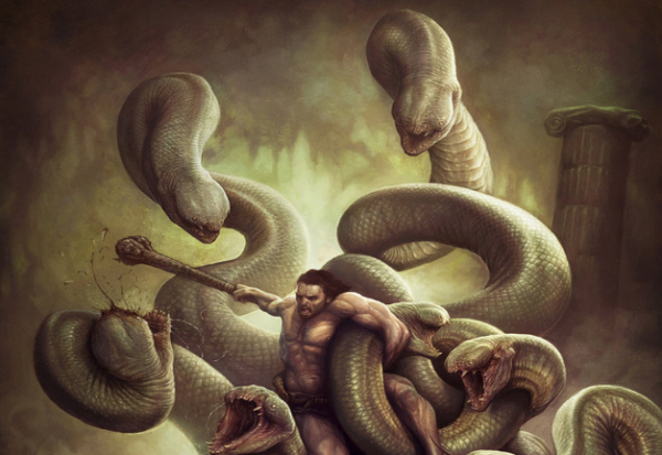 E Heracles entrou no pântano de Lerna, com a boca e o nariz cobertos para não respirar o cheiro venenoso do monstro. Quando Hidra saiu de sua caverna, ela estava pronta para devorar o intruso. Mas ele estava decido a matar a terrível criatura. Então começou a cortas as cabeças de Hidra o mais rápido que podia. Mesmo que o mostro gritasses de dor, os pequenos ferimentos estavam longe de ameaçar sua vida. Pelo contrário, só o deixou ainda mais forte, com novas cabeças crescendo em seu corpo.
