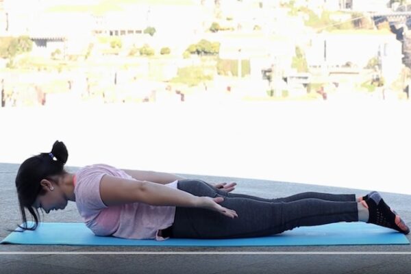 O primeiro exercício é basicamente ficar deitado de barriga para baixo com os braços ao longo do corpo. Após entrar nessa posição, deve-se elevar os braços e a cabeça do chão, contraindo as costas, como é possível ver na imagem. Repita de 3 a 5 vezes.