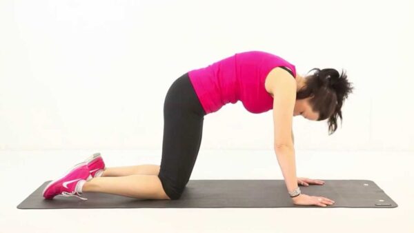 Para fazer esse exercício, fique de quatro, mantendo as mãos na altura dos ombros. Começando do cóccix, leve a parte média das costas para cima e logo depois vá para baixo. Faça dez repetições.
