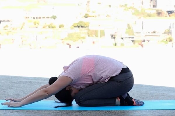 À partir do exercício 2, mantenha as mãos no mesmo lugar, porém, sentando sobre os calcanhares e mantendo as costas alongadas. Empurre os braços contra o chão para manter as costas em alongamento máximo. Mantenha durante 30 segundos a 1 minuto.